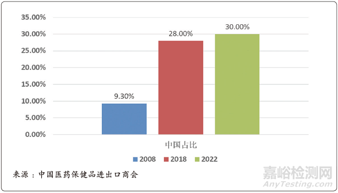 歐美等發(fā)達(dá)國家的醫(yī)藥產(chǎn)業(yè)起步較早:19世紀(jì),現(xiàn)代制藥工業(yè)始于德國;20世紀(jì),現(xiàn)代生物技術(shù)發(fā)源于美國;20世紀(jì)70年代,美國的生物醫(yī)藥產(chǎn)業(yè)起步,并在此后長時間占據(jù)了領(lǐng)先地位。在20世紀(jì)90年代前,歐洲和美國曾是全球最主要的原料藥生產(chǎn)區(qū),其技術(shù)水平先進(jìn)、生產(chǎn)規(guī)模大。而20世紀(jì)90年代后,受環(huán)保壓力、生產(chǎn)成本等因素的影響,歐洲和美國的原料藥產(chǎn)能逐步下降;與此同時,發(fā)展中國家在擁有較低人力成本的基礎(chǔ)上,不斷增加原料藥的研發(fā)投入、優(yōu)化生產(chǎn)工藝、提高技術(shù)水平,因此原料藥生產(chǎn)重心逐步由歐美向其他區(qū)域轉(zhuǎn)移(主要為亞太區(qū)域)[1],以中國和印度為代表的新興市場快速崛起。目前,全球原料藥生產(chǎn)主要集中在中國、意大利、印度、美國、歐洲及其他地區(qū)等,中國已經(jīng)成為全球最大的原料藥生產(chǎn)基地,中國原料藥產(chǎn)能全球占比已從2008年的約9.3%增長到2022年的約30%,如圖3所示。