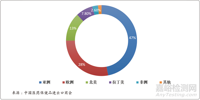 目前中國為全球最主要的原料藥出口國,過去10年中國原料藥發(fā)展雖不平穩(wěn),但出口基本始終保持增長,有效保障了全球醫(yī)藥產(chǎn)業(yè)的發(fā)展。中國原料藥出口收入在2013-2022年10年間除2015年、2016年兩年出口收入略有降低外,基本保持增長趨勢,尤其是疫情爆發(fā)后,中國原料藥出口收入增長明顯,2019-2022年4年出口收入增速依次為8.47%、9.53%、17.00%、23.99%,如圖7所示。結(jié)合圖7與圖8數(shù)據(jù)可以發(fā)現(xiàn),2016-2022年中國原料藥出口量持續(xù)增加,出口量增速遠(yuǎn)低于出口收入增速,說明近些年原料藥出口單位均價增加明顯,中國原料藥產(chǎn)業(yè)結(jié)構(gòu)持續(xù)優(yōu)化,逐步由低附加值的大宗原料藥向特色原料藥或?qū)@纤庌D(zhuǎn)型。目前,亞洲、歐洲和北美洲仍為中國原料藥的主要出口市場,占據(jù)整個出口市場的85%以上(如圖9所示),而印度和美國穩(wěn)居中國原料藥出口的前兩名,其中,印度市場出口總額占中國原料藥總出口額的12.77%,美國市場出口總額占中國原料藥出口總額的 10.39%。由圖9還可以看出,拉丁美洲、非洲等新興市場也有著一定的占比,原料藥企后續(xù)可將其作為快速增長點(diǎn)進(jìn)行布局。