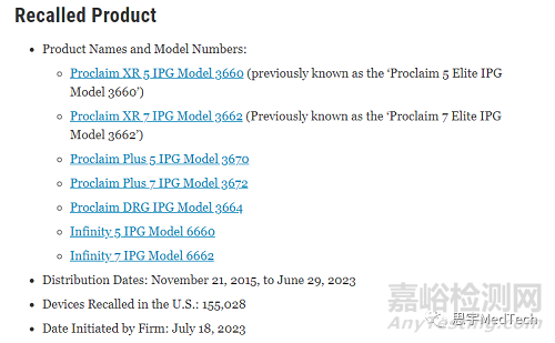 2023年9月14日,美國(guó)FDA官網(wǎng)發(fā)布消息稱(chēng),對(duì)雅培(Abbott )的Proclaim系列和Infinity系列的多個(gè)神經(jīng)刺激系統(tǒng)確認(rèn)為一級(jí)召回,這也是最嚴(yán)重的召回級(jí)別。據(jù)報(bào)道,召回原因?yàn)樯鲜鱿盗挟a(chǎn)品無(wú)法退出磁共振(MRI)成像模式,這會(huì)造成連接和通訊中斷從而帶來(lái)安全隱患。目前已有186起事故,73人受傷,沒(méi)有死亡報(bào)告。