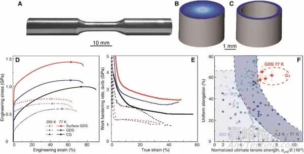 圖1 梯度位錯結構(GDS)合金及其典型低溫力學行為。 (A)狗骨頭棒狀宏觀拉伸樣品;(B) 樣品截面示意圖,顯示自表(深藍色)及芯(淺灰色)梯度結構分布;(C) 梯度位錯管狀樣品標距段三維X-射線重構形貌(管壁厚度~0.45 mm );(D) GDS, 管狀GDS和粗晶的拉伸工程應力-應變曲線和 (E) 真應力-應變曲線; (F) 均勻塑性與歸一化抗拉強度曲線, 表明梯度位錯結構合金的優(yōu)異低溫綜合力學性能。