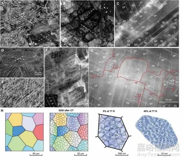 圖2 梯度位錯結構表層77 K拉伸結構演變特征。拉伸應變3%時截面SEM (A) 和TEM (B) 結果,晶粒內不同滑移面上相互交割的層錯束穿過多個位錯胞;(C) 對應的HAADF-STEM結果表明層錯束包含超高密度的層錯和孿晶結構。拉伸應變40%時截面SEM (D-E) 和TEM (F) 結果,晶粒內已產生高密度細化結構-納米層錯疇;(G) 對應的HAADF-STEM結果表明位錯胞被極小層錯疇進一步細化;(H) 77 K拉伸變形過程中由原始位錯胞逐漸轉變?yōu)楦呙芏葋喪{米層錯疇的動態(tài)結構細化示意圖。