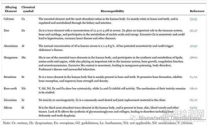 表1、鎂合金中合金元素生物學(xué)功能的簡要總結(jié)