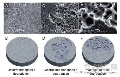 通常鎂合金的降解伴隨著局部腐蝕,導(dǎo)致鎂合金支架的力學(xué)性能迅速下降甚至局部斷裂。如何實現(xiàn)均勻降解的問題對于鎂合金支架應(yīng)用至關(guān)重要。袁廣銀教授團隊研究了 JDBM、WE43 和 AZ31 合金在人工等離子體中的降解過程,發(fā)現(xiàn) JDBM 的腐蝕速率最低。腐蝕形貌表明,JDBM 的表面非常均勻(圖 3A和B),而在 WE43 和 AZ31 的表面都觀察到嚴重的局部腐蝕(圖 3C - F)。