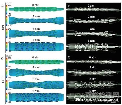 圖5、模擬SIN支架(A, B)和OPT支架(C, D)擴張過程中的最大主應(yīng)力分布