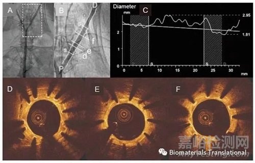 圖6、旋轉(zhuǎn)霧化噴涂技術(shù)在 JDBM 支架上進行負載雷帕霉素 (RAPA) 的聚(D,L-乳酸)(PDLLA)涂層,動物造模術(shù)后3個月定量冠狀動脈造影及OCT結(jié)果。