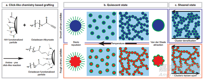 本研究開發(fā)了一種兩步接枝法,以可比的覆蓋率將十八烷基重現(xiàn)結合到粗糙和光滑的 SiO2 顆粒表面(圖 1a)。在靜止狀態(tài)下,由于誘導吸引力相互作用的機制相同,因此光滑和粗糙原生粒子系統(tǒng)的網(wǎng)絡預計會相似。然而,在變形過程中和變形后,本研究預計網(wǎng)絡的幾何形狀會因表面粗糙度而發(fā)生變化(圖 1b)。粗糙的顆粒能夠相互交錯,從而抵抗剪切力引起的致密化,而光滑的顆粒則會相互滾動并致密化成簇,這樣就更難破碎(圖 1c)。因此,本研究預計屈服轉變和觸變反應會有所不同。