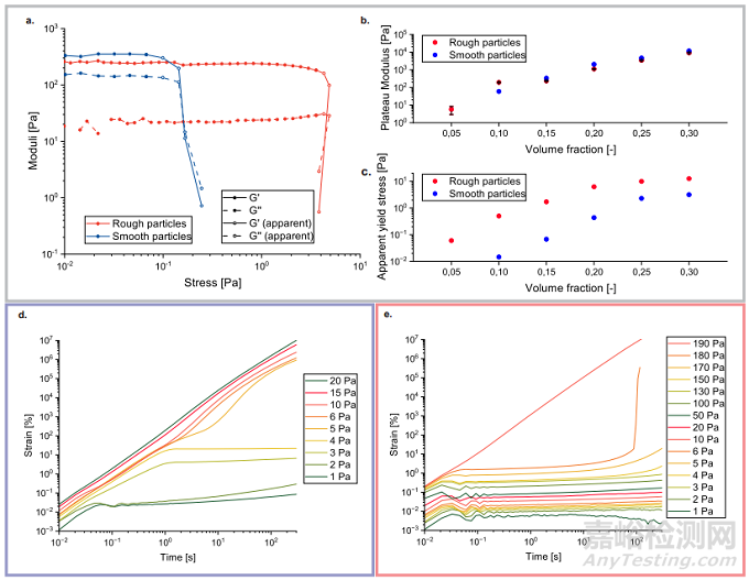 粗糙(均方根=7.2 毫米)和光滑(均方根=0.7 毫米)顆粒凝膠的屈服行為差異可通過流變特性分析檢測出來。圖 2a 顯示了粗糙顆粒和光滑顆粒的 ? = 0.15 凝膠的應力振幅掃描結果。圖 2b 顯示了兩種顆粒的彈性模量G’隨體積分數(shù) ? 的變化情況。令人驚訝的是,光滑顆粒和粗糙顆粒的彈性模量G’隨體積分數(shù)的變化是相同的,除了最低體積分數(shù),粗糙顆粒的滲流閾值較低(j = 0.05)。在接近滲濾閾值的稀疏系統(tǒng)中,粗糙顆粒的額外表面積可以促進網(wǎng)絡的形成,而在較高的體積分數(shù)(j > 0.1)下,系統(tǒng)更加擁擠,這意味著不需要額外的表面積來促進網(wǎng)絡的形成。當考慮表觀振蕩屈服應力(圖 2c)時,與相同體積分數(shù)下的光滑粒子系統(tǒng)相比,粗糙粒子系統(tǒng)的屈服應力幅值明顯更高。這種屈服延遲在連續(xù)蠕變實驗中觀察得更為清楚,圖 2d、e 分別表示了光滑顆粒和粗糙顆粒的情況。對于體積分數(shù)為 ? = 0.25 的光滑顆粒凝膠,在低應力(小于 4 Pa)條件下可觀察到彈性狀態(tài),甚至在短時間尺度內會出現(xiàn)一些蠕變紋。
