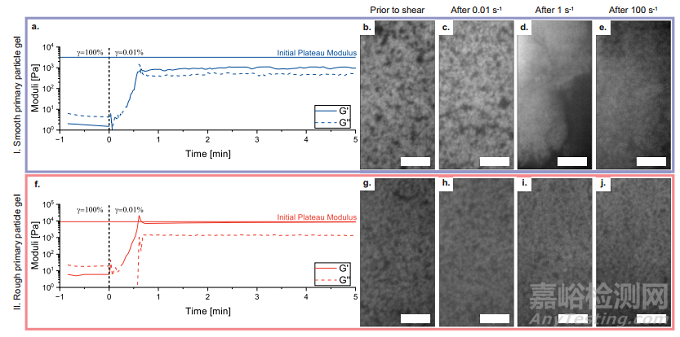 延遲和更突然的屈服并不是區(qū)分粗糙和光滑顆粒凝膠的唯一特征。雖然顆粒的選擇是基于其流變學對比度,本研究在尺寸和折射率匹配方面并沒有針對共聚焦成像進行優(yōu)化,但在圖3中,仍通過連續(xù)剪切后的振蕩恢復實驗和共聚焦顯微鏡揭示了粗糙顆粒表面交錯的后果。圖 3a 和 b 中的流變學數(shù)據(jù)顯示的是振蕩恢復測量結果。本研究首先對體積分數(shù)為 ? = 0.25 的光滑和粗糙初級粒子凝膠進行 γ = 100% 的剪切,使兩種凝膠流化(光滑凝膠σmax = 7.4 Pa,粗糙凝膠σmax = 25.9 Pa)。然后,讓它們在 γ = 0.01% 的 LVE 區(qū)域恢復(光滑凝膠 σequ = 0.23 Pa,粗糙凝膠 σequ = 0.98 Pa)。光滑顆粒凝膠從未恢復到初始高模量(用連續(xù)水平線表示),即使時間遠遠超過 5 分鐘。而對于粗糙的初級粒子系統(tǒng),彈性模量在 3.5 分鐘后完全恢復,測量結果比光滑顆粒的更加穩(wěn)定。粗糙顆粒凝膠之所以能快速完全恢復,是因為顆粒之間可以相互交錯,從而防止顆粒密集成緊密的團塊。粗糙凝膠的流態(tài)化會導致開放的團塊發(fā)生破裂,從而更容易恢復其初始幾何形狀。當剪切力減弱時,光滑顆粒凝膠在剪切過程中產生的致密簇無法分離,因此凝膠會重新形成更大、更致密的初級簇。這一點在圖 3 的共聚焦圖像中也很明顯,圖 3 將剪切前的結構與 0.01 s-1、1 s-1 和 100 s-1 剪切后的結構進行了比較。粗糙凝膠和光滑凝膠在剪切前的結構非常相似。在光滑顆粒凝膠的共聚焦圖像中(圖 3a),在 0.01 s-1 的剪切條件下會出現(xiàn)一些裂縫和較大的空隙。在 1 s-1 的剪切條件下,圖像中出現(xiàn)了明顯的富顆粒區(qū)和貧顆粒區(qū)。當剪切速度為 100 s-1 時,樣品顯示出一個顆粒密集的區(qū)域,但沒有明顯的網(wǎng)絡結構;顆粒已被剪切力分解,但似乎仍有一些顆粒團存在。在粗糙顆粒凝膠的共聚焦圖像中(圖 3g-j),網(wǎng)絡結構在所有圖像中都很普遍,這表明表面突起的交錯可能會阻礙流動致密化。