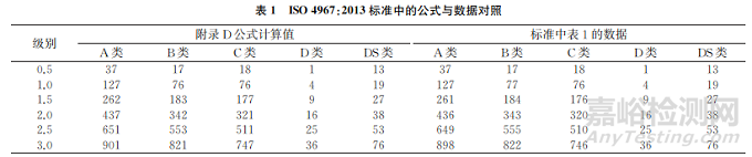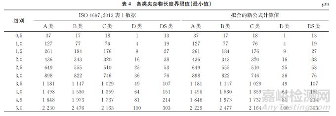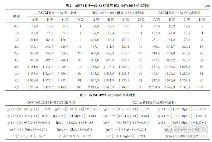 ISO 4967:2013 采用的標(biāo)準(zhǔn)圖譜與ASTM E45—2018a使用的圖譜除了DS類夾雜物外基本一 致。ASTM E45—2018a中最高為5.0級,0.5~3.0級的值取整,得到結(jié)果與ISO 4967:2013中的數(shù)值一致(除DS類),將ASTM E45—2018a中的值用ISO 4967:2013標(biāo)準(zhǔn)給出的計(jì)算公式進(jìn)行驗(yàn)證,發(fā)現(xiàn)除了D類、DS類外,A類、B類、C類夾雜物均存在差異(見表1),而將ASTM E45—2018a提供的公式計(jì)算出的夾雜物長度與表1進(jìn)行對比發(fā)現(xiàn),除了A類4.5級對應(yīng)的長度有較大差異外,其余的長度基本一致。將 A類4.5級的長度由1898μm改成1848μm(見表2),再通過夾雜物長度擬合成新的公式(見表3,式中i為級別,l為長度,n為顆粒度,d為直徑),將新擬合的公式計(jì)算得到的長度取整,得到結(jié)果與ISO 4967:2013的值基本吻合,僅A類、B類和C類5.0級存在1μm的差(見表4),新擬合成的計(jì)算公式較原標(biāo)準(zhǔn)公式更精確。