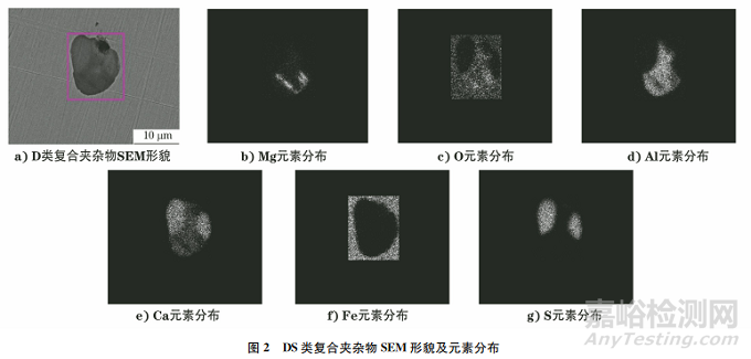 為此,標(biāo)準(zhǔn)修訂時(shí)對這部分內(nèi)容進(jìn)行了重點(diǎn)修改。首先,明確了將非傳統(tǒng)類型夾雜物納入常規(guī)夾雜物評級,按其形態(tài)與最接近的A、B、C、D、DS類夾雜物合并進(jìn)行評定;其次,明確了根據(jù)產(chǎn)品標(biāo)準(zhǔn)或協(xié)議要求,可借助顯微鏡偏振光或掃描電子顯微鏡(SEM)等設(shè)備識別夾雜物的化學(xué)特征,并加以標(biāo)注。化學(xué)特征以分子式或(和)主要元素表示。如果能譜分析能明確夾雜物組成,就可用分子式表示,含量(面積或長度)多的寫在前面,分子式之間用加號表示。如果能譜分析不能明確夾雜物組成,則可用化學(xué)元素表示其主要成分,各元素之間用逗號分開。例如,對于復(fù)合單顆粒DS類夾雜物(見圖2),其由Ca、Al、Mg、O、S等幾種主要元素組成,說明有氧化物和硫化物兩種類型,其中氧化物面積>50%,Ca元素含量高于 Al元素含量,Ca元素寫在前面,記為DS(Ca,Al,Mg)O+CaS。