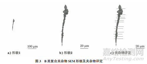 圖3為B類復(fù)合夾雜物SEM形貌及夾雜物評定,這個(gè)串狀復(fù)合夾雜物由Ca、Al、O、S等元素組成,表明該夾雜物由氧化物和硫化物兩種類型組成,圖中氧化物長度占優(yōu),記為B(Ca,Al)O+CaS。