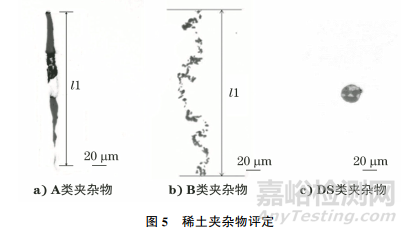 添加稀土元素能改變夾雜物的分布和形貌,從而大大改善鋼材的使用性能。目前,稀土鋼為國家重點(diǎn)發(fā)展的鋼種之一,所以標(biāo)準(zhǔn)修訂也增加了稀土復(fù)合夾雜物的評定及化學(xué)特征表示。稀土夾雜物也是按其形貌與附錄C中最近似的標(biāo)準(zhǔn)圖片進(jìn)行對比評級的,并可借助顯微鏡偏振光和掃描電子顯微鏡的能譜,標(biāo)注化學(xué)特征(見圖5)。