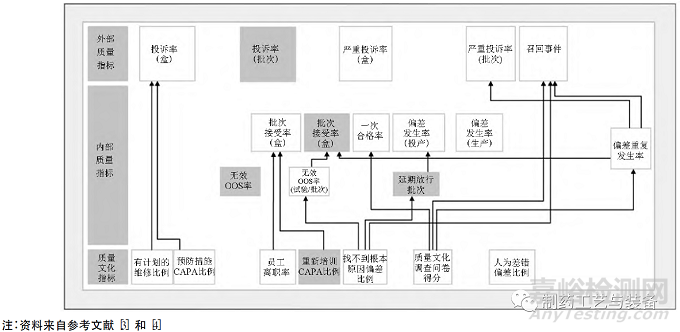 2015—2016 年,美國FDA委托國際制藥工程協(xié)會(ISPE) 開展了兩期大規(guī)模質(zhì)量量度研究,以確定表征藥品質(zhì)量體系有效性的指標(biāo)。ISPE使用調(diào)查問卷收集了數(shù)十家原料藥和制劑工廠數(shù)據(jù),包括基于產(chǎn)品和基于工廠的指標(biāo),如投訴率、接受批次率、無效OOS 率、CAPA 有效性等。線性回歸分析結(jié)果顯示了大部分指標(biāo)是密切相關(guān)性的,即表征質(zhì)量文化的一些指標(biāo),最終也會反映到質(zhì)量體系各方面性能指標(biāo)和最終的產(chǎn)品質(zhì)量指標(biāo)[3,4]。美國FDA 質(zhì)量量度計劃指標(biāo)相關(guān)性分析見圖1。