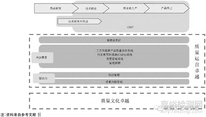 美國FDA在質(zhì)量量度計劃的基礎(chǔ)之上,于2020年下半年啟動了質(zhì)量管理成熟度項目(quality management maturity,QMM) 。質(zhì)量管理成熟度是為實現(xiàn)質(zhì)量方針和目標(biāo),衡量已經(jīng)建立的質(zhì)量體系各業(yè)務(wù)流程的一致性、可靠性和穩(wěn)健性水平,關(guān)注企業(yè)對業(yè)務(wù)流程和質(zhì)量體系持續(xù)改進(jìn)方面的表現(xiàn)。FDA認(rèn)為,在符合cGMP的基礎(chǔ)上形成基于ICH Q10的體系管理模式,于持續(xù)改進(jìn)中達(dá)成質(zhì)量運營卓越、質(zhì)量文化卓越的狀態(tài),是質(zhì)量管理成熟的必然路徑[5]。美國FDA 基于ICH Q10的質(zhì)量成熟度模型見圖2。