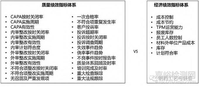 本研究對多家跨國制藥企業(yè)質(zhì)量體系的有效性進(jìn)行了調(diào)研,結(jié)果顯示這些企業(yè)都具備較為成熟的質(zhì)量體系管理機制。質(zhì)量量度方面,具備科學(xué)的、完整的質(zhì)量管理體系量化指標(biāo)。企業(yè)會定期監(jiān)測和分析質(zhì)量體系運行的有效性、穩(wěn)定性,異常趨勢常??梢栽趩栴}發(fā)生前就為體系持續(xù)改善明確方向; 質(zhì)量文化方面,企業(yè)將關(guān)鍵質(zhì)量指標(biāo)列入年度績效考核,與其經(jīng)濟指標(biāo)形成了良好的制衡關(guān)系。企業(yè)以質(zhì)量為驅(qū)動、持續(xù)改善的文化也得到了充分體現(xiàn)。跨國制藥企業(yè)質(zhì)量與經(jīng)濟績效指標(biāo)體系示例見圖3、圖4。