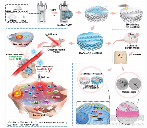 殘留的腫瘤細(xì)胞和骨組織缺損是臨床骨肉瘤治療的兩個(gè)關(guān)鍵挑戰(zhàn)。近日,上海大學(xué)陳雨教授、馮煒副研究員和山東大學(xué)齊魯醫(yī)院劉培來教授通過將MoO3−x亞納米線集成到3D打印生物活性玻璃支架上構(gòu)建自適應(yīng)功能組織工程支架,從而提出亞納米醫(yī)學(xué)概念。MoO3−x亞納米線是通過一鍋水熱法合成的,該方法在酸性腫瘤微環(huán)境中聚集,并與過氧化氫反應(yīng)產(chǎn)生活性氧,用于特定的化學(xué)動(dòng)力學(xué)治療。而且它們可以在生理?xiàng)l件下快速降解而不引起毒性。此外,自適應(yīng)增強(qiáng)的光熱轉(zhuǎn)換使腫瘤靶向光熱治療,同時(shí)增強(qiáng)化學(xué)動(dòng)力學(xué)治療。通過免疫印跡分析、共聚焦激光掃描顯微鏡觀察和mRNA轉(zhuǎn)錄組分析,Mo5+-Mo6+轉(zhuǎn)變使脂質(zhì)過氧化物積累和谷胱甘肽耗盡,從而導(dǎo)致谷胱甘肽過氧化物酶4蛋白失活和鐵死亡。所構(gòu)建的支架除了具有抗骨肉瘤的穩(wěn)健性外,還能刺激大鼠骨間充質(zhì)干細(xì)胞的分化和增殖,促進(jìn)骨缺損的成骨。因此,這種多功能支架不僅驗(yàn)證了亞納米醫(yī)學(xué)的概念,而且為骨組織工程提供了一個(gè)很有前途的臨床策略。
