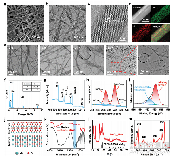掃描電子顯微鏡(SEM)和透射電子顯微鏡(TEM)圖像顯示,MoO3−xSNWs為典型的線狀結(jié)構(gòu)(圖2a、b)。線狀結(jié)構(gòu)的高分辨率透射電子顯微鏡(HRTEM)圖像顯示晶格間距為0.35nm(圖2c)。對(duì)MoO3−xSNWs的高角環(huán)形暗場(chǎng)圖像、特征元素映射和相應(yīng)的能量色散X射線光譜分析顯示,Mo和O的比例分布良好(圖2d、f)。TEM觀察發(fā)現(xiàn)較長(zhǎng)的攪拌時(shí)間導(dǎo)致卷繞結(jié)構(gòu)(圖2e)。X射線光電子光譜(XPS)顯示其表面的化學(xué)成分和狀態(tài),其中Mo、O和C在全測(cè)量掃描中顯示(圖2g)。Mo 3d的高分辨率XPS譜顯示,235.18和232 eV的結(jié)合能與Mo6+的存在有關(guān),而233.8和230.8 eV的結(jié)合能與Mo5+的存在有關(guān)(圖2h)。在O 1s光譜中,在531.36 eV處的峰值歸因于氧缺陷(圖2i)。MoO3−xSNWs的獨(dú)特結(jié)構(gòu)與氧缺陷的不對(duì)稱分布密切相關(guān)(圖2j)。傅里葉變換紅外光譜鑒定了MoO3−xSNWs的結(jié)構(gòu)(圖2k)。MoO3−xSNWs的典型衍射峰被很好地索引到標(biāo)準(zhǔn)的α-MoO3六邊形PDF卡(圖2l)。MoO3−xSNWs的拉曼光譜如圖2m所示。