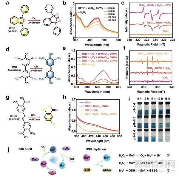 1,3-二苯異苯并呋喃(DPBF)是一種黃色的1O2指示劑,與1O2反應(yīng)后褪色(圖3a)。DPBF與H2O2和MoO3−xSNWs孵育30 min后,455 nm處的特征吸收峰下降(圖3b)。電子自旋共振(ESR)光譜證實(shí)1O2的產(chǎn)生(圖3c),其中2,2,6,6-四甲基哌啶(a 1O2捕獲劑)與H2O2和MoO3−xSNWs反應(yīng),顯示一個(gè)1:1:1的特征信號(hào)峰。當(dāng)溫度升高到37℃后,信號(hào)逐漸增強(qiáng),表明1O2的產(chǎn)率隨溫度的升高而增加。以3,3′,5,5′·-四甲基聯(lián)苯胺(TMB)作為·OH指標(biāo),評(píng)價(jià)·OH的產(chǎn)量(圖3d)。隨著濃度的增加,在650 nm處的特征吸光度峰的強(qiáng)度顯著增加(圖3e)。使用5,5-二甲基-1-吡咯烷n-氧化物作為自旋陷阱,通過ESR定性地確認(rèn)了·OH的產(chǎn)生(圖3f)。與其他基團(tuán)相比,(GSH +H2O2+MoO3−xSNWs)組在412 nm處的吸收峰明顯較低(圖3h),說明MoO3−xSNWs介導(dǎo)的催化反應(yīng)可以耗盡GSH。因此可以合理地推斷,MoO3−xSNWs中的Mo5+與H2O2反應(yīng)產(chǎn)生·OH和1O2,而產(chǎn)生的Mo6+消耗GSH產(chǎn)生氧化谷胱甘肽(圖3j)。為了評(píng)估其穩(wěn)定性和生物降解性,將MoO3−xSNWs分散在不同pH值的磷酸鹽緩沖溶液中(圖3i)。