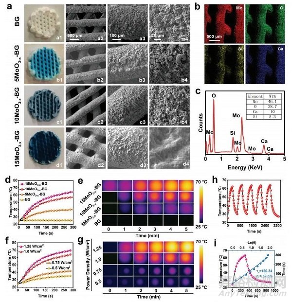 獲得的支架表現(xiàn)出設(shè)計(jì)良好、均勻交錯(cuò)的微觀結(jié)構(gòu),隨著MoO3−xSNWs濃度的增加,藍(lán)色逐漸變暗(圖4a1-d1)。SEM圖像顯示,BG支架表現(xiàn)出良好的大孔和粗糙的表面(圖4b2-d2),MoO3−xSNWs修飾賦予BG支架光滑的表面(圖4b2、d4)。相應(yīng)的元素映射圖像證實(shí)Mo、O、Si和Ca的分布均勻(圖4b),表明支架與MoO3−xSNWs的成功整合。在808 nm激光照射下,溫度隨時(shí)間顯著增加,且呈劑量和功率密度依賴性(圖4d-g)。純BG的溫度變化可以忽略不計(jì)(圖4d),說明MoO3−xSNWs的存在可以有效地、快速地將NIR光轉(zhuǎn)化為熱能。MoO3−x-BG支架的光熱性能在5次激光開/關(guān)照射周期后的衰退可以忽略不計(jì)(圖4h),從而確定光熱學(xué)穩(wěn)定性。MoO3−x-BG支架的光熱轉(zhuǎn)換效率為52.5%(圖4i),表明它們具有用于后續(xù)光熱癌消融的潛力。