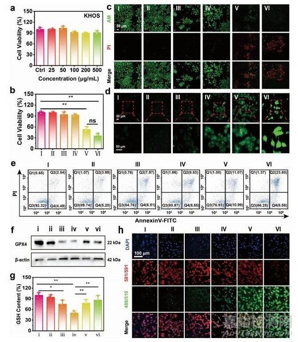 在人成骨肉瘤(KHOS)細(xì)胞和人臍靜脈內(nèi)皮細(xì)胞研究MoO3−xSNWs的細(xì)胞相容性(圖5a),即使在500gmL−1的高濃度下處理24 h后,其細(xì)胞毒性可以忽略不計(jì)。隨后使用MoO3−xSNWs研究了體內(nèi)PTT增強(qiáng)的CDT(圖5b),結(jié)果表明PTT可以促進(jìn)CDT的殺傷作用。使用鈣綠素乙酰甲酯(綠色)和碘化丙啶(PI 紅色)染色活/死亡細(xì)胞,確定MoO3−xSNWs介導(dǎo)和PTT增強(qiáng)的CDT的顯著治療效果(圖5c)。MoO3−xSNWs+H2O2處理后的細(xì)胞凋亡率為22.1%,在激光照射下進(jìn)一步上升至32.4%(圖5e),表明加熱可促進(jìn)治療效果。為了研究其殺傷機(jī)制,采用2,7-二氯熒光素二乙酸酯(DCFH-DA,綠色)試驗(yàn),通過共聚焦激光掃描顯微鏡(CLSM)來驗(yàn)證細(xì)胞內(nèi)ROS的生成(圖5d)。根據(jù)蛋白印跡分析(圖5f),MoO3−xSNWs+H2O2組的GPX4表達(dá)量明顯低于H2O2和MoO3−xSNWs+H2O2組,而MoO3−xSNWs+H2O2組的表達(dá)水平遠(yuǎn)低于H2O2組。KHOS細(xì)胞在對(duì)照組、NIR和MoO3−xSNWs組中表現(xiàn)出強(qiáng)烈的紅色和弱綠色熒光(圖5h),從而表明脂質(zhì)過氧化作用(LPO)的生成最少。