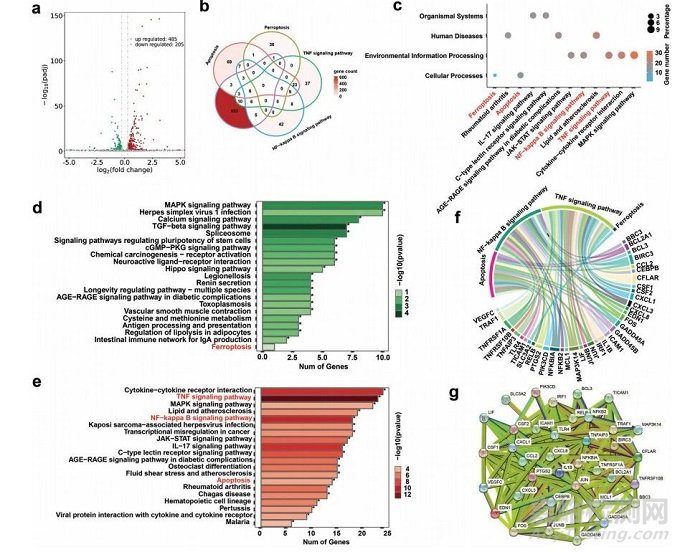 根據(jù)火山圖和熱圖(圖6),協(xié)同治療組較對(duì)照組共鑒定出約690個(gè)差異表達(dá)基因(DEGs),其中485個(gè)上調(diào)基因,205個(gè)下調(diào)基因,主要與炎癥調(diào)節(jié)和應(yīng)激反應(yīng)有關(guān)。如維恩圖所示,690個(gè)DEGs涉及鐵死亡、凋亡、腫瘤壞死因子信號(hào)通路和核因子-kappaB信號(hào)通路(圖6b),證實(shí)MoO3−xSNWs治療可緩解氧化應(yīng)激誘導(dǎo)的細(xì)胞凋亡、鐵死亡和炎癥。篩選690個(gè)DEGs進(jìn)行KEGG分析,結(jié)果顯示在MoO3−xSNWs介導(dǎo)的協(xié)同治療中,這四種信號(hào)通路與鐵死亡、凋亡和炎癥顯著相關(guān)。這37個(gè)相關(guān)功能基因的和弦圖表明,MoO3−xSNWs在OS治療過程中發(fā)揮鐵死亡和炎癥調(diào)節(jié)因子的作用(圖6f)。通過蛋白-蛋白相互作用網(wǎng)絡(luò)分析從4個(gè)通路中基因與DEGs的交叉點(diǎn)中獲得的37個(gè)相關(guān)功能基因(圖6g),發(fā)現(xiàn)與主要蛋白相連的鄰近蛋白涉及PTGS2、CXCL1家族和MAP3K14,這是鐵死亡和炎癥的關(guān)鍵調(diào)控蛋白。綜上結(jié)果表明,MoO3−xSNWs+H2O2+ NIR治療可以調(diào)控與鐵死亡、細(xì)胞凋亡和炎癥調(diào)控相關(guān)的基因表達(dá)模式。