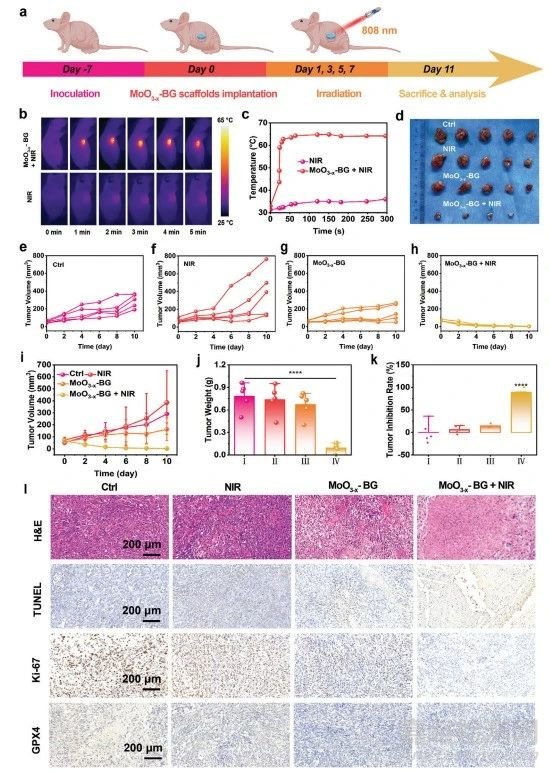 由于其具有良好的體外抗腫瘤效果,接下來研究其對(duì)OS的體內(nèi)治療性能(圖7a)。MoO3−x-BG支架+ NIR激光組在5 min內(nèi)的腫瘤溫度從33.2°C迅速增加到64.9°C,而NIR激光組的溫度變化可以忽略不計(jì)(圖7b、c)。MoO3−x-BG+NIR組以100%的抑制率完全消除腫瘤(圖7d-k)。為了進(jìn)一步驗(yàn)證抗腫瘤療效,收集所有組的腫瘤切片進(jìn)行病理評(píng)估(圖7l)。分別采用H&E染色、TUNEL和Ki-67抗體染色方法評(píng)估腫瘤組織的壞死/凋亡和細(xì)胞增殖活性。H&E染色結(jié)果顯示MoO3−x-BG+NIR激光組有大量OS細(xì)胞壞死。TUNEL圖像顯示,MoO3−x-BG+NIR激光組的凋亡細(xì)胞多于其他各組,從而驗(yàn)證其有效性。Ki-67染色圖像顯示,MoO3−x-BG+NIR激光組在四組中OS細(xì)胞增殖最少,表明癌細(xì)胞的增殖受到顯著抑制。GPX4的免疫組化分析顯示,MoO3−x-BG+NIR激光組中GPX4的表達(dá)下調(diào)。