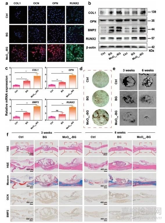 CLSM圖像顯示不同處理后的成骨蛋白,即1型膠原蛋白(COL1)、骨鈣素(OCN)、骨橋蛋白(OPN)和runt相關(guān)轉(zhuǎn)錄因子2(RUNX2)的表達(dá)(圖8a)。MoO3−x-BG組的熒光強(qiáng)度明顯強(qiáng)于Ctrl組和BG組,從而驗(yàn)證MoO3−x-BG支架可以促進(jìn)rBMSC的增殖。MoO3−x-BG支架組中成骨蛋白COL 1、OPN、RUNX2和骨形態(tài)發(fā)生蛋白2(BMP2)的表達(dá)水平均顯著高于其他各組(圖8b),從而進(jìn)一步證實(shí)MoO3−x-BG支架的成骨特性。與其他組不同,MoO3−x-BG支架組促進(jìn)成骨相關(guān)基因的表達(dá)(圖8c),證明MoO3−x-BG支架具有理想的成骨分化能力。在孵育21天后,MoO3−x-BG支架組比Ctrl和BG組含有更多的鈣結(jié)節(jié)(圖8d)。采集的顱骨顯微計(jì)算機(jī)斷層掃描(micro-CT)重建圖像直接證實(shí)缺損區(qū)域的新骨形成(圖8e),MoO3−x-BG支架組在第3周從邊緣擴(kuò)展至顱骨缺損區(qū)中心,到第6周時(shí)幾乎看不見空洞。接下來進(jìn)行組織學(xué)和免疫組化染色,以進(jìn)一步評(píng)估顱骨修復(fù)的療效(圖8f),結(jié)果提示MoO3−x-BG支架促進(jìn)骨組織形成,膠原纖維生成及成骨基因表達(dá)。