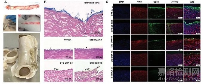 栓塞6h后固定樣本,切片并染色以進(jìn)行內(nèi)皮覆蓋(圖7A)。未經(jīng)處理的主動(dòng)脈切片的HE染色顯示內(nèi)皮細(xì)胞層在動(dòng)脈的管腔側(cè),中膜上方觀察到(圖7B 藍(lán)色*)。在用HE染色的載玻片初步觀察內(nèi)皮細(xì)胞消融后,對(duì)這些切片進(jìn)行免疫組化(圖7C)。切片染色內(nèi)皮標(biāo)記物CD31,吞噬素染色細(xì)胞骨架,DAPI染色細(xì)胞核。在未治療的主動(dòng)脈切片中可見(jiàn)兩層主動(dòng)脈壁,內(nèi)膜和中膜。通過(guò)STB-DOX配方(STB-DOX 0.1、STBDOX 0.3和STB-DOX 0.5組),觀察到隨著DOX濃度的增加,綠色信號(hào)逐漸減少,表明內(nèi)皮層的去除。