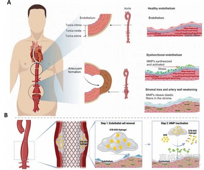 基質(zhì)金屬蛋白酶(MMP-2和MMP- 9)是一類鋅內(nèi)肽酶,通過(guò)炎癥反應(yīng)過(guò)程中釋放的因子觸發(fā)AAAs中細(xì)胞外基質(zhì)(ECM)的分解(圖1A)。多西環(huán)素(DOX)是一種四環(huán)素抗生素,用于抑制基質(zhì)金屬蛋白酶和內(nèi)皮剝脫。局部注射DOX可引起內(nèi)皮損傷,導(dǎo)致局部止血,使其閉塞。因此,在血管內(nèi)動(dòng)脈瘤修復(fù)(EVAR)的內(nèi)滲漏治療中,通過(guò)內(nèi)皮剝脫和MMP抑制,局部輸送到動(dòng)脈瘤部位有效緩解主動(dòng)脈擴(kuò)張(圖1B)。