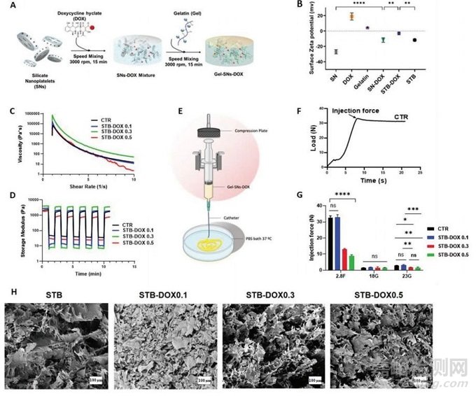 SNs的表面電荷分布為各向異性,具有正面和負(fù)面(圖2A)。為了證實(shí)DOX添加劑對(duì)水凝膠凈電荷的影響,測(cè)量水凝膠的zeta電位(圖2B),結(jié)果表明,SNs的表面負(fù)電荷為−25mV,而DOX的表面正電荷為+19 mV。在SNs中引入DOX導(dǎo)致DOX的zeta電位顯著降低,表明這兩個(gè)部分之間可能存在靜電相互作用。所有水凝膠粘度都隨著剪切速率增加而降低(圖2C)。圖2D顯示在包含高應(yīng)變(100%)和低應(yīng)變(0.01%)的交替循環(huán)的時(shí)間掃描中,剪切變薄和流變恢復(fù)的影響,在較大的應(yīng)變振幅下,STB-DOX 0.5%和STB-DOX 1%明顯軟于Gel-SN。在較大的應(yīng)變振幅下,Gel-SN-DOX 0.3的斷裂網(wǎng)絡(luò)明顯軟于Gel-SN(圖2E-G),表明更容易注射。通過(guò)掃描電鏡對(duì)凍干水凝膠的微觀結(jié)構(gòu)特性進(jìn)行表征(圖2H),在沒(méi)有DOX的情況下,STB凝膠的孔隙大小表現(xiàn)出明顯的異質(zhì)性,分布范圍為20~150μm。當(dāng)將DOX引入STB凝膠時(shí),孔徑分布變得更加均勻,主要在20~50μm范圍內(nèi),這一結(jié)果表明,DOX影響STB凝膠的孔隙結(jié)構(gòu),使孔隙徑分布更加均勻并變窄。