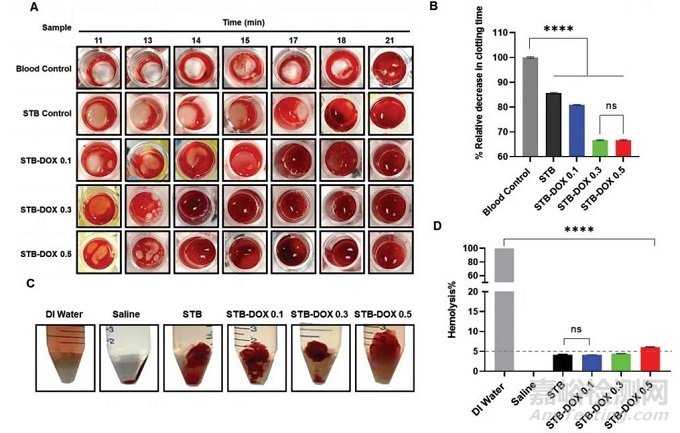使用體外凝血試驗(yàn)檢測(cè)DOX補(bǔ)充劑在Gel-SN平臺(tái)上的止血作用(圖3A、B),與未經(jīng)處理的血液對(duì)照組相比,STB和STB-DOX水凝膠顯著減少凝塊形成的時(shí)間。采用溶血實(shí)驗(yàn)研究水凝膠的血液相容性。不含DOX和低劑量DOX(0.1%和0.3% w/v)的STB水凝膠顯示溶血百分比低于5%的標(biāo)準(zhǔn)安全極限。而添加0.5% w/v的DOX后,溶血百分比提高到5%以上。因此,0.3% w/v DOX含量的STB-DOX水凝膠為后續(xù)優(yōu)化的合適配方(圖3C、D)。