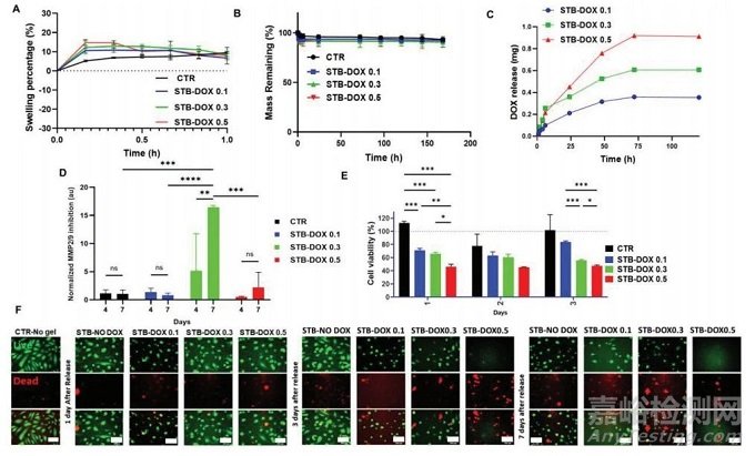 為避免損害周圍的動(dòng)脈組織,隨著時(shí)間的推移,監(jiān)測(cè)水凝膠在磷酸鹽緩沖鹽水(PBS)中孵育時(shí)的溶脹率(%)(圖4A),結(jié)果表明,所有STB條件在前20 min內(nèi)達(dá)到最大腫脹,并在研究的剩余時(shí)間內(nèi)保持平衡。為了檢測(cè)復(fù)合水凝膠的降解性,將STBs在37°C的PBS中孵育175小時(shí)(圖4B)。在PBS中,以37°C檢測(cè)STBs中DOX的釋放譜(圖4C),所有配方在6h內(nèi)均出現(xiàn)爆發(fā)性釋放,在72 h內(nèi)持續(xù)釋放,釋放速率逐漸衰減。通過(guò)MMP活性對(duì)內(nèi)皮細(xì)胞和巨噬細(xì)胞活性的影響和細(xì)胞毒性進(jìn)行評(píng)估(圖4D、E)?;钏廊旧Y(jié)果顯示,當(dāng)DOX濃度增加到0.5% w/v時(shí),死細(xì)胞(紅色)的數(shù)量多于活細(xì)胞(綠色)(圖4F)。因此,根據(jù)釋放率、細(xì)胞活力和MMP抑制結(jié)果,選擇STB-DOX 0.1和0.3組進(jìn)行下一步評(píng)價(jià)。