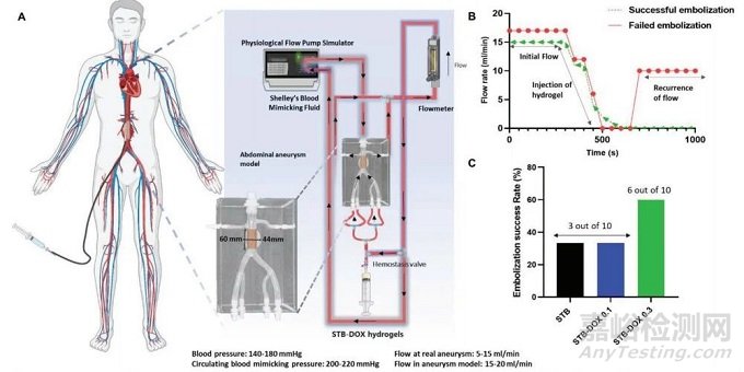 如圖5A所示,采用體外臺(tái)式試驗(yàn)檢測(cè)Gel-SN-DOX水凝膠在閉塞血流中的效率,根據(jù)動(dòng)脈瘤的典型大小,采用特定的設(shè)計(jì)在體外復(fù)制動(dòng)脈內(nèi)膜滲漏。水凝膠注射的各個(gè)階段和腰椎動(dòng)脈同時(shí)發(fā)生的血流變化如圖5B所示,系統(tǒng)內(nèi)的血流循環(huán)設(shè)置為支架插入后動(dòng)脈瘤模型達(dá)到約15-20 mL min−1,對(duì)應(yīng)實(shí)際動(dòng)脈瘤內(nèi)滲漏流量。圖5C比較了不同配方的栓塞成功率。相比于其他組,STB-DOX 0.3水凝膠有更高的栓塞成功率。
