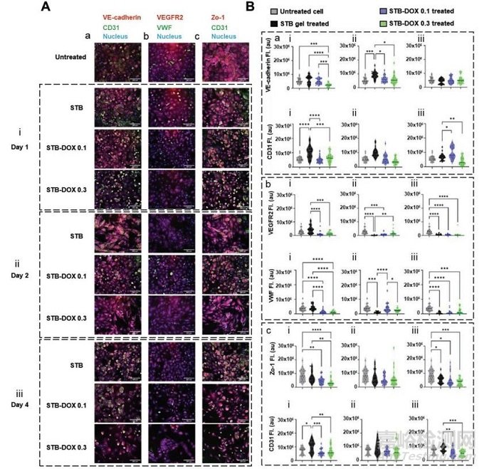 通過(guò)分析CD31、VE-鈣粘蛋白、ZO-1、血管內(nèi)皮生長(zhǎng)因子受體2(VEGFR2)和Von血友病因子(VWF)等蛋白的表達(dá),深入了解STB-DOX治療對(duì)內(nèi)皮細(xì)胞功能、血管生成和止血的潛在影響(圖6)。為了研究這些治療方法對(duì)血管結(jié)構(gòu)完整性的影響,使用ImageJ軟件進(jìn)一步定量CD31陽(yáng)性細(xì)胞上VE-鈣粘蛋白的表達(dá)的表達(dá)(圖6Aa、Ba)。接下來(lái)研究STB-DOX處理對(duì)CD31陽(yáng)性HUVECs中ZO-1表達(dá)的影響(圖6Ac、Bc)。STB-DOX濃度的增加下調(diào)HUVECs中VEGFR2的表達(dá)(圖6Ab、Bb),表明該信號(hào)通路受到損害。綜上所述,本研究結(jié)果表明,STB-DOX治療可能會(huì)對(duì)HUVECs中這些關(guān)鍵蛋白的表達(dá)和活性產(chǎn)生不良影響,從而影響血管的健康和功能。