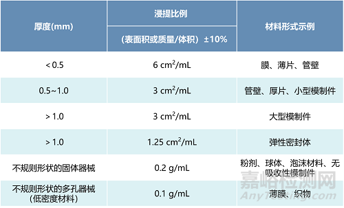 根據(jù)標(biāo)準(zhǔn)要求,我們的加嚴(yán)浸提和極限浸提可能會(huì)影響可浸提物的變化,例如溫度過(guò)高會(huì)導(dǎo)致聚合或者降解等。因此,在進(jìn)行試驗(yàn)設(shè)計(jì)時(shí),應(yīng)充分考慮樣品的材料和性質(zhì),經(jīng)論述選取合適的浸提條件。只有條件適合的浸提條件,才能達(dá)到浸提的目的。在選取樣品和浸提液的提取比例時(shí),需參考GB/T 16886.12-2017/ ISO 10993-12: 2012中的浸提比例,如下: