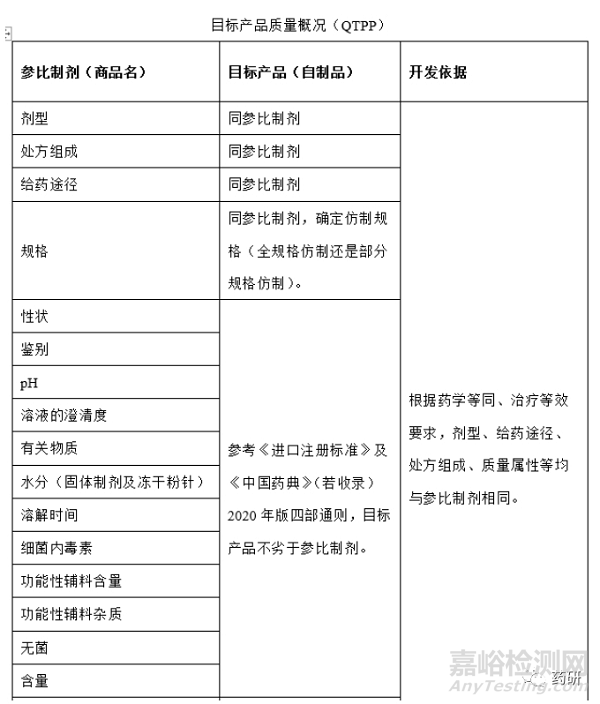 根據(jù)參比制劑上市國藥典(原料藥和制劑項)、參比制劑國內(nèi)進(jìn)口說明書等資料,確定參比制劑處方工藝信息,未查詢出來的處方工藝信息運(yùn)用反向工程以確定,初步形成QTPP,根據(jù)小試實驗數(shù)據(jù)完善QTPP,再次確定QTPP;舉例如下: