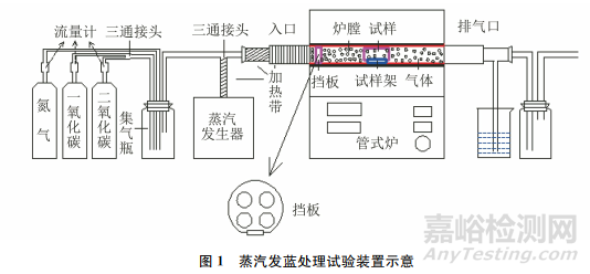 在管式氣氛爐中對試樣進行熱處理,試驗裝置如圖1所示。發(fā)藍處理氣氛為還原性氣氛和純 N2,發(fā)藍溫度分別為450,480,510,540,570℃,蒸汽處理時間為1h和1.5h,以10℃/min的速率將溫度升至300℃,再以5℃/min的速率將溫度升至發(fā)藍溫度。加熱前,先開啟N25min,以排空爐膛中的空氣,放入試樣,檢查整個管路的密封性,在確保氣路密封,進、排氣口通暢的條件下,開啟熱處理程序,將溫度升至300℃,在CO、CO2、N2的體積分數(shù)比為1∶2∶7時進行發(fā)藍處理,觀察氣體流量計讀數(shù),調(diào)節(jié)爐膛內(nèi)氣氛,通入水蒸氣進行發(fā)藍處理。在純N2氣氛中發(fā)藍處理時,不需要調(diào)節(jié)爐內(nèi)氣氛,溫度到達發(fā)藍溫度時,立即通入水蒸氣;保溫完畢后,立即關(guān)閉蒸汽閥,氣氛維持原來配比,隨爐冷卻至100℃,取出試樣。