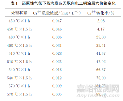 (1)對烘烤固化后的無取向電工鋼在還原性氣氛和純N2氣氛下進行蒸汽發(fā)藍處理,其涂層中的六價鉻含量均降低,隨著蒸汽發(fā)藍溫度的升高,六價鉻含量減少,六價鉻的轉(zhuǎn)化率升高。在還原性氣氛和相同發(fā)藍溫度下,隨著發(fā)藍處理時間的延長,六價鉻含量下降,轉(zhuǎn)化率升高。