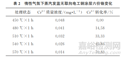 由圖4及表2可知:在純N2氣氛條件下,當蒸汽發(fā)藍溫度升高到480℃時,六價鉻的質(zhì)量濃度開始減少,由0.048mg/L減少至0.041mg/L,轉(zhuǎn)化率為14.58%;當發(fā)藍溫度升高到570℃時,六價鉻的轉(zhuǎn)化率為70.83%,轉(zhuǎn)化率達到最大??傮w上看,隨著發(fā)藍溫度的升高,六價鉻質(zhì)量濃度降低。分析認為,對無取向硅鋼涂層烘烤固化后,在氮氣氣氛下進行蒸氣發(fā)藍處理時,水蒸氣雖有一定的弱氧化性,但在高溫條件下六價鉻有向低價態(tài)鉻轉(zhuǎn)化的趨勢,其氧化性不足以將三價鉻氧化成六價鉻,即在惰性氣體條件下進行較高的發(fā)藍溫度處理,也可以促進六價鉻的轉(zhuǎn)化,使六價鉻含量降低,不會使六價鉻質(zhì)量濃度升高。