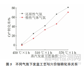 (2)在相同蒸汽發(fā)藍工藝條件下,與惰性氣氛相比較,在還原性氣氛條件下,六價鉻的轉(zhuǎn)化率較高。