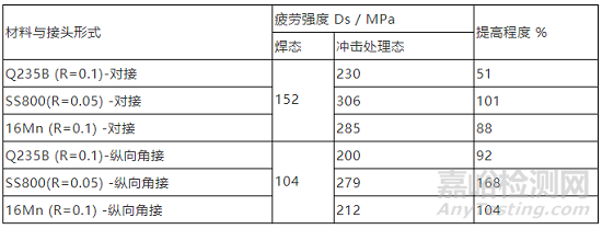 近年來發(fā)展起來的超聲沖擊提高焊接接頭及結(jié)構(gòu)疲勞強度的方法,其機理與錘擊和噴丸基本一致.但這種方法執(zhí)行機構(gòu)輕巧,可控性好,使用靈活方便、噪音極小、效率高、應(yīng)用時受限少,成本低而且節(jié)能,適用于各種接頭,是一種理想的焊后改善焊接接頭疲勞性能的方法。對幾種典型焊接結(jié)構(gòu)用鋼的對接和非承載縱向角接頭實施超聲沖擊處理,然后進行了焊態(tài)與沖擊處理的對比疲勞試驗,研究了超聲沖擊法改善焊接頭疲勞強度的實際效果,對比結(jié)果見表2??梢?,焊接接頭經(jīng)超聲沖擊處理后,疲勞強度提高了50%~170%,效果十分顯著。