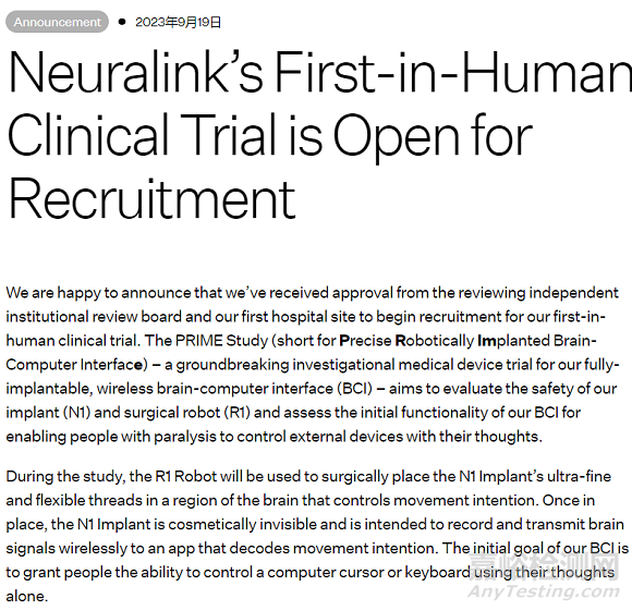 9月19日,馬斯克的腦機(jī)接口公司Neuralink宣布,該公司已獲得了獨(dú)立機(jī)構(gòu)審查委員會(huì)的批準(zhǔn),開(kāi)始首次人體臨床試驗(yàn)招募人員。