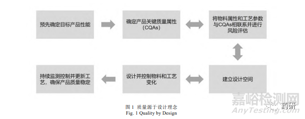 質(zhì)量源于設(shè)計(jì)(quality by design,QbD),實(shí)際上是指藥品研發(fā)設(shè)計(jì)中對(duì)藥品質(zhì)量的設(shè)計(jì)賦予,其理念就是重視設(shè)計(jì)的科學(xué)性,發(fā)揮研究的主動(dòng)性,研究建立全面、系統(tǒng)的質(zhì)量研究與風(fēng)險(xiǎn)控制網(wǎng)絡(luò),使藥品質(zhì)量得到較好地控制,以實(shí)現(xiàn)預(yù)定的目標(biāo)[9, 10]。隨著 QbD 成為世界范圍內(nèi)藥物開發(fā)與管控的主流思想,一套系統(tǒng)的研究方法逐漸應(yīng)用于藥物的工藝質(zhì)量設(shè)計(jì)。我國(guó)制藥行業(yè)的制劑研發(fā)生產(chǎn)制備理念也正在由“質(zhì)量源于檢測(cè)”向“質(zhì)量源于設(shè)計(jì)(QbD)”邁進(jìn)。即判斷藥品質(zhì)量是否合格從以前依賴于藥品的最終檢驗(yàn),向藥物的設(shè)計(jì)和研究階段的控制轉(zhuǎn)變,從源頭上逐步強(qiáng)化了質(zhì)量監(jiān)督管理體系,保證了藥品質(zhì)量,提高了用藥安全性[11],應(yīng)用 QbD 理念生產(chǎn)制劑的目的就是在制劑生產(chǎn)過程中對(duì)產(chǎn)品的質(zhì)量進(jìn)行科學(xué)有效的控制[12, 13],從目標(biāo)藥物的設(shè)計(jì)源頭開始考慮到藥物的質(zhì)量,其核心是確定制藥過程中的預(yù)選化合物的基本性質(zhì)、關(guān)鍵處方和工藝參數(shù)等,并通過建立工藝模型來確定兩者之間的關(guān)系,以此構(gòu)建設(shè)計(jì)空間,對(duì)藥品進(jìn)行質(zhì)量控制[14, 15],如圖 1 所示。