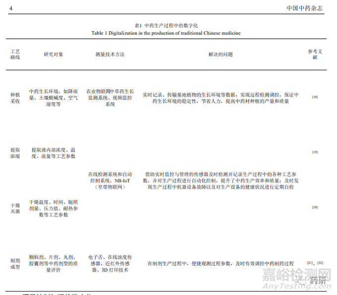 在線檢測(cè)技術(shù)被廣泛應(yīng)用于中藥材提取、分離純化、干燥、混合、制粒、壓片等操作單元中[48]。8 中國(guó)中藥雜志提取是中藥制劑生產(chǎn)過程中的第一個(gè)環(huán)節(jié),原料成分復(fù)雜、工藝條件要求高,引入在線檢測(cè)技術(shù),如近紅外光譜分析技術(shù)(Near Infrared Spectrum Instrument,NIRS),可以實(shí)時(shí)監(jiān)測(cè)目標(biāo)成分的變化,能有效解決中藥成分多、控制難等難題[49]。周雨楓等[50]在三七的提取過程中引入近紅外光譜分析技術(shù)(NIRS),在線檢測(cè)分析提取過程中皂苷的含量,基本實(shí)現(xiàn)提取生產(chǎn)過程中關(guān)鍵指標(biāo)和異常情況的實(shí)時(shí)監(jiān)測(cè),后期企業(yè)在實(shí)際生產(chǎn)過程中可以融入近紅外系統(tǒng),建立在線檢測(cè)模型,實(shí)現(xiàn)提取過程檢測(cè)數(shù)字化。干燥是中藥生產(chǎn)過程中能耗較大的操作單元,中藥材的含水率是干燥過程中的重要物理參數(shù),也是判斷干燥工藝終點(diǎn)的重要依據(jù)[51, 52]。目前,常用的水分檢測(cè)方法是在樣品干燥過程中取樣,然后進(jìn)行離線測(cè)定,此方法不便于中藥的連續(xù)生產(chǎn)。在干燥過程中引入在線微波水分檢測(cè)技術(shù),依賴微波的穿透性測(cè)定藥材深層的水分,實(shí)現(xiàn)物料含水率的無損在線檢測(cè)。張偉等[53]基于微波反射法設(shè)計(jì)谷物含水率在線檢測(cè)裝置,分別進(jìn)行了室內(nèi)靜態(tài)研究和田間收割試驗(yàn)研究,此模型具有較高的準(zhǔn)確度。制粒通常是固體劑型生產(chǎn)中的重要步驟,LiangZhong 等[54]在流化制粒過程中借助在線過程分析技術(shù)(Process Analytical Technology,PAT)定量的 NIRS 技術(shù),在線監(jiān)測(cè)流化床制粒過程中的活性藥物成分(Active pharmaceutical ingredient,API)含量均勻性,并通過離線高效液相色譜測(cè)量驗(yàn)證了方法的API 含量預(yù)測(cè)準(zhǔn)確性,為制粒過程中 API 含量的測(cè)定提供了新思路。中藥生產(chǎn)過程中借助多種先進(jìn)的傳感器技術(shù),及時(shí)反饋實(shí)時(shí)監(jiān)測(cè)數(shù)據(jù)和分析結(jié)果,實(shí)現(xiàn)中藥制劑產(chǎn)品質(zhì)量的即時(shí)監(jiān)控,有效保證了藥品質(zhì)量,為中藥連續(xù)生產(chǎn)、過程控制提供了大量數(shù)據(jù)基礎(chǔ),提升智能化工藝裝備過程質(zhì)量控制能力,提高生產(chǎn)效率。