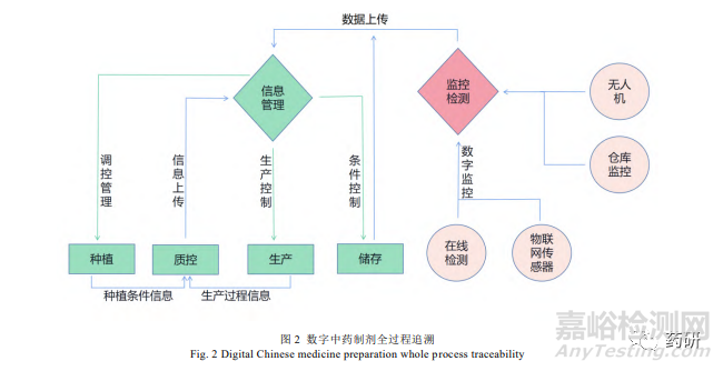 在中藥制劑產(chǎn)品銷售、服務(wù)應(yīng)用環(huán)節(jié)提供相應(yīng)的數(shù)據(jù)信息,與消費(fèi)者建立信息互通鏈,闡明產(chǎn)品的高質(zhì)量、臨床價(jià)值與安全性。借助現(xiàn)代信息技術(shù),如互聯(lián)網(wǎng)、5G等信息化手段,基于物聯(lián)網(wǎng)農(nóng)業(yè)傳感器,可全程監(jiān)控并記錄中藥材生產(chǎn)過程,并對(duì)中藥的品名信息、種植信息、檢測(cè)信息、出入庫信息和銷售配送信息等進(jìn)行編號(hào),錄入中草藥產(chǎn)品質(zhì)量追溯系統(tǒng),實(shí)現(xiàn)中草藥供應(yīng)鏈流通追溯[36]。為中藥制劑產(chǎn)品領(lǐng)取它們自己的“身份證”,使用者通過掃描產(chǎn)品包裝上的“溯源碼”,即可知道該產(chǎn)品生產(chǎn)全過程數(shù)據(jù)、質(zhì)量以及治療特性等,使得中藥制劑具有絕對(duì)唯一、不可篡改的特性,基于通過中藥制劑“一物一碼”技術(shù)手段,實(shí)現(xiàn)從藥材從生產(chǎn)種植管理、采收、制劑、質(zhì)量安全檢測(cè)、裝箱、銷售到臨床應(yīng)用環(huán)節(jié)的全過程追溯,實(shí)現(xiàn)了從種植到銷售的中草藥的高監(jiān)管模式,打通了中藥材流通渠道,突破了信息流通壁壘,改善了流通效率,實(shí)現(xiàn)了中藥制劑的“來源可知、過程可查、質(zhì)量可保、責(zé)任可究”[37],如圖 2 所示。