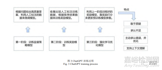 ChatGPT 是一種以會(huì)話為中心的語言模型,具有超強(qiáng)的性能和超大的文本數(shù)據(jù)庫,通過學(xué)習(xí)大量現(xiàn)成文本和對(duì)話集合,能理解人類不同類型指令中蘊(yùn)含的不同意圖,實(shí)現(xiàn)即時(shí)對(duì)話,流暢的回答各種問題等等,其訓(xùn)練過程如圖 3 所示。若使用者指出其錯(cuò)誤,ChatGPT 會(huì)承認(rèn)其對(duì)專業(yè)技術(shù)的不了解,聽取意見并根據(jù)反饋優(yōu)化回答,同時(shí)可以質(zhì)疑不正確的問題以及支持連續(xù)多輪對(duì)話。ChatGPT 使用來自人類反饋的強(qiáng)化學(xué)習(xí)進(jìn)行訓(xùn)練,超強(qiáng)大的數(shù)據(jù)算法可以幫助人類跳脫個(gè)人信息處理能力上限,從而更快地找到更高效創(chuàng)新的路徑,將其引入中藥制劑設(shè)計(jì)環(huán)節(jié),通過學(xué)習(xí)分析現(xiàn)有臨床研究以及非臨床研究的文本數(shù)據(jù),研究物質(zhì)組分在生產(chǎn)過程中的量值傳遞規(guī)律,闡明藥物組分與藥效之間的關(guān)系,優(yōu)選藥物的物料配比和工藝參數(shù),確定生產(chǎn)工藝,實(shí)現(xiàn)藥物設(shè)計(jì)環(huán)節(jié)與生產(chǎn)過程一體化,解決了制劑設(shè)計(jì)環(huán)節(jié)生產(chǎn)要素整合遲緩等問題。目前,已有制藥企業(yè)涉足了 AI 新藥研發(fā)領(lǐng)域,利用類似于ChatGPT 的生成式 AI,完成了有效活性藥物的設(shè)計(jì),有望用于研制新藥,與傳統(tǒng)制劑設(shè)計(jì)相比較,ChatGPT 的引入可使生產(chǎn)過程更精確、更智能,使目標(biāo)中藥制劑質(zhì)量更符合預(yù)期,充分發(fā)揮藥材的藥性,節(jié)約研發(fā)時(shí)間,降低研發(fā)成本,實(shí)現(xiàn)高質(zhì)量、高效率制藥。