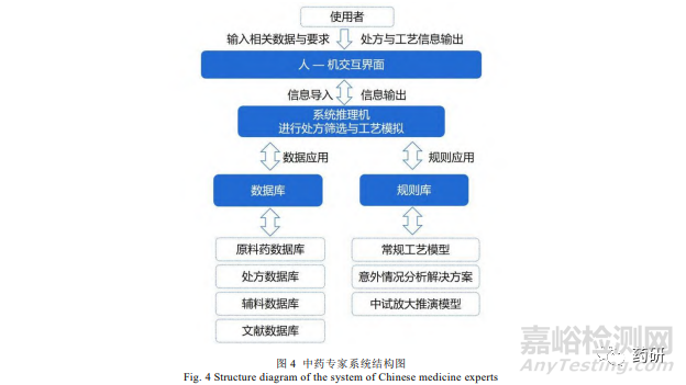 專家系統(tǒng)是學(xué)習(xí)人類專家提供的專業(yè)知識(shí)和經(jīng)驗(yàn),模擬人類專家的思維過程解決領(lǐng)域問題的計(jì)算機(jī)程序系統(tǒng)[39]。專家系統(tǒng)由數(shù)據(jù)庫、規(guī)則庫、推理機(jī)、人機(jī)界面組成,專家系統(tǒng)的運(yùn)行流程大概為用戶在人機(jī)界面提出問題后,推理機(jī)通過包含大量專家知識(shí)和經(jīng)驗(yàn)的知識(shí)庫進(jìn)行分析匹配,將問題及結(jié)果暫存在數(shù)據(jù)庫并反饋給使用者,如圖 4 所示[40]。專家系統(tǒng)已經(jīng)成功應(yīng)用于工業(yè)、農(nóng)業(yè)、醫(yī)療等領(lǐng)域,將專家系統(tǒng)的概念引入到中藥制劑的研究中相對(duì)較晚。中藥專家系統(tǒng)在前期研究階段,收集并儲(chǔ)存一定中藥制劑原輔料的特性以及制劑工藝相關(guān)參數(shù),確定原料藥特征與生產(chǎn)工藝以及產(chǎn)品質(zhì)量之間的關(guān)系,構(gòu)建數(shù)據(jù)庫。另外,通過常規(guī)工藝和中試放大模型模擬制劑工藝,借助計(jì)算機(jī)預(yù)測(cè)、發(fā)現(xiàn)并解決制劑生產(chǎn)中的問題,確保中藥制劑的品質(zhì)以及制劑工藝的可重復(fù)性,確定符合預(yù)期的制劑工藝[41]。目前,針對(duì)中藥復(fù)雜的原料成分,已初步建成了可運(yùn)行的中藥專家系統(tǒng),主要用于部分中藥制劑的處方設(shè)計(jì)和生產(chǎn)工藝條件優(yōu)選,涉及丸劑[42]、干法制粒[43]、噴霧干燥抗黏[44]等。在中藥新藥研發(fā)過程中,建立一套中藥制劑專家模擬系統(tǒng)進(jìn)行制劑工藝設(shè)計(jì),可以縮減研發(fā)成本,縮短開發(fā)周期,降低研發(fā)風(fēng)險(xiǎn),提高新藥研發(fā)效率。未來中藥專家系統(tǒng)可以以知識(shí)庫的容量擴(kuò)展和智能推理為目的,實(shí)現(xiàn)中藥專家系統(tǒng)自主學(xué)習(xí)、自主更新,形成設(shè)備-檢測(cè)-計(jì)算機(jī)系統(tǒng)三位一體的實(shí)時(shí)在線檢測(cè)控制系統(tǒng),即全自動(dòng)數(shù)字化中藥制劑生產(chǎn)工藝。借助中藥專家系統(tǒng)等數(shù)字化手段,結(jié)合質(zhì)量源于設(shè)計(jì)(QbD)理念,有望邁向智能化制藥,實(shí)現(xiàn)制藥全過程的數(shù)字追溯。