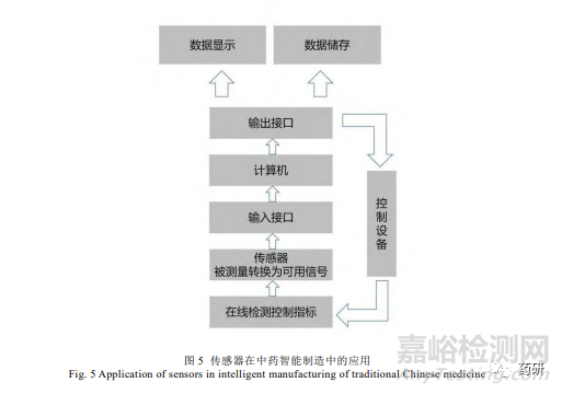 節(jié)中藥質(zhì)量評(píng)價(jià)是中藥標(biāo)準(zhǔn)化與現(xiàn)代化的關(guān)鍵問題之一[45]。中藥制劑的生產(chǎn)由多種工序組成,涉及眾多過程參數(shù),包括工藝參數(shù)、質(zhì)控參數(shù)、物料性質(zhì)等,這些參數(shù)的變化可能會(huì)影響最終的藥品質(zhì)量[46]。構(gòu)建以數(shù)字化為導(dǎo)向的中藥質(zhì)量評(píng)價(jià)體系,一定程度上可以解決目前中藥質(zhì)量評(píng)價(jià)過程中分析效率低、分析結(jié)果滯后等問題,使得中藥的質(zhì)量控制、質(zhì)量評(píng)價(jià)越來越精細(xì)和準(zhǔn)確[47],滿足中藥制藥行業(yè)的大批量生產(chǎn)需求。推進(jìn)數(shù)字化評(píng)價(jià)中藥制劑質(zhì)量的核心在于以多種先進(jìn)傳感器技術(shù)為基礎(chǔ)的在線檢測(cè)與分析技術(shù)的應(yīng)用,能實(shí)時(shí)、準(zhǔn)確測(cè)量和控制關(guān)鍵指標(biāo),極大提高生產(chǎn)效率,保證產(chǎn)品質(zhì)量,如圖 5 所示。