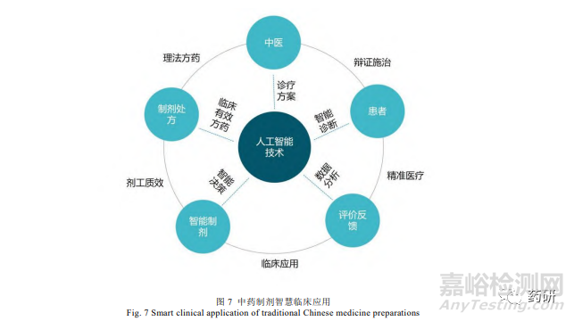 在中藥制劑服務(wù)環(huán)節(jié),以大數(shù)據(jù)為基礎(chǔ),以客戶為中心,建立以中藥材信息管理為支撐的信息平臺(tái)。即應(yīng)用人工智能技術(shù)實(shí)現(xiàn)四診合參智能化,客觀性采集患者信息,根據(jù)收集到的數(shù)據(jù)運(yùn)用中醫(yī)藥理論進(jìn)行辯證施治,參考處方數(shù)據(jù)庫、個(gè)性需求等開出中醫(yī)處方,依據(jù)處方制定臨方制劑方案,確定工藝路線、工藝參數(shù)以及工序組合,智能添加輔料,并對(duì)制劑質(zhì)量進(jìn)行在線智能化監(jiān)控,實(shí)現(xiàn)裝備柔性組合、參數(shù)智能決策,使得方劑合理、制劑工藝恰當(dāng)、質(zhì)量可靠、療效良好[65]?;颊咴谑褂弥兴幹苿┻^程中對(duì)中藥制劑的評(píng)價(jià)、用戶與用戶之間以及用戶與醫(yī)生間相互交流產(chǎn)生的數(shù)據(jù),通過大數(shù)據(jù)等分析方法,深層次探索用戶的健康狀況、病情監(jiān)測(cè)模式等,實(shí)現(xiàn)以人的健康管理為中心的精準(zhǔn)醫(yī)療,促進(jìn)中藥材臨床應(yīng)用的智能化、個(gè)性化,如圖 7 所示。