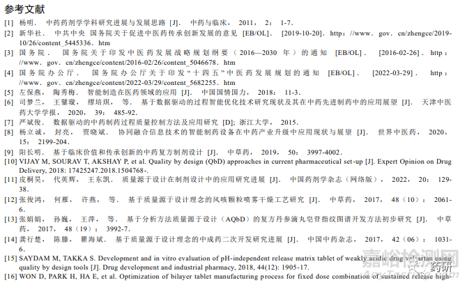 QbD 的重點(diǎn)是辨識(shí)中藥制造關(guān)鍵質(zhì)量屬性,在設(shè)計(jì)空間中,藥物的物料配比、生產(chǎn)工藝參數(shù)等可以在一定范圍內(nèi)變動(dòng),進(jìn)行調(diào)整優(yōu)化,借助數(shù)字技術(shù)將藥品設(shè)計(jì)與制備環(huán)節(jié)相連接。中藥制劑成分復(fù)雜,多為復(fù)方制劑,存在很多無用成分,在進(jìn)行質(zhì)量設(shè)計(jì)時(shí),借助數(shù)據(jù)采集與分析方法,量化表征原輔料屬性參數(shù)、工藝參數(shù)、設(shè)備參數(shù)與產(chǎn)品質(zhì)量指標(biāo),形成產(chǎn)品知識(shí)庫,根據(jù)量效關(guān)系確定藥效成分質(zhì)量控制范圍或者有效成分比例控制要求,從源頭上進(jìn)行質(zhì)量管理,從而設(shè)計(jì)制備出最優(yōu)質(zhì)量的藥品?;?QbD 理念,對(duì)由高劑量二甲雙胍鹽酸鹽和速釋層中的低劑量酒石酸依格列汀組成的雙層壓片工藝參數(shù)進(jìn)行優(yōu)化,借助透射拉曼光譜作為過程分析技術(shù)評(píng)估了酒石酸依格列汀在大規(guī)模制備的優(yōu)化雙層片劑中的含量均勻性,實(shí)現(xiàn)了有效開發(fā)固定劑量組合雙層片劑[16]。根據(jù) QbD 監(jiān)管框架,將制劑配方、工藝變量與產(chǎn)品的關(guān)鍵質(zhì)量屬性相關(guān)聯(lián),研究現(xiàn)有顆粒的球形度、尺寸和尺寸分布,優(yōu)化關(guān)鍵工藝和配方因素階段,以促進(jìn)最終顆粒劑的多功能使用,在 QbD 框架內(nèi)開發(fā)了一種新的多功能配方平臺(tái)[17]。
